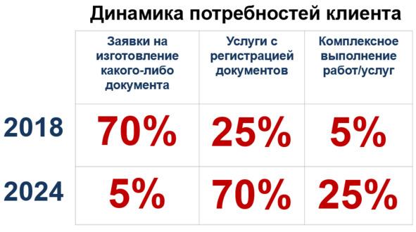 Сейчас на рынке происходит трансформация конечного продукта. Конечный продукт, на мой взгляд, остался тем же — достижение результата, например, постановка жилого дома на кадастровый учет. Однако, в отличие от 2016—2018 гг., когда потребитель самостоятельно выполнял большинство действий, кроме изготовления технического плана, сейчас конечный продукт выглядит так же, но потребитель выбирает подрядчика, который готов закрыть все задачи и предоставить готовый конечный результат, тем самым переложив весь комплекс работ и услуг по созданию конечного продукта на исполнителя или подрядчика.