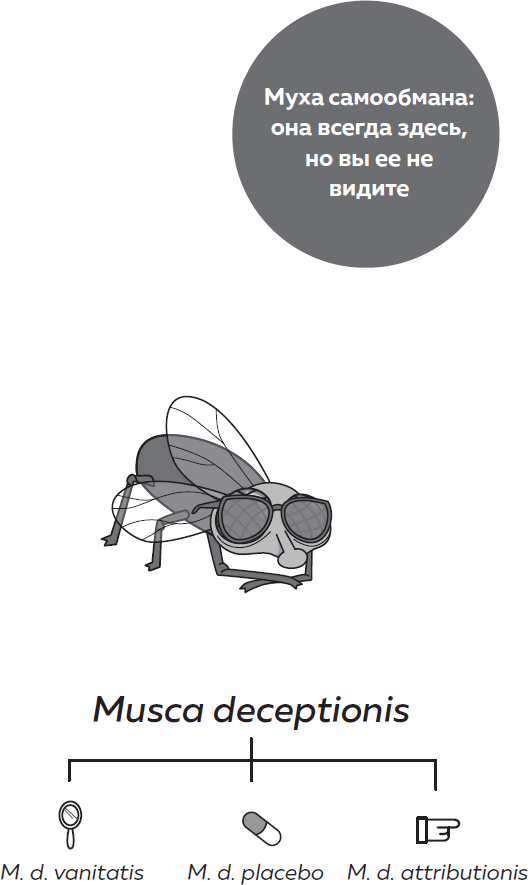 Подвиды: М. d. vanitatis (муха завышенной самооценки), М. d. placebo (Муха плацебо), M. d. attributionis (Муха атрибуции). Эти виды мух практически не поддаются уничтожению и зачастую едва заметны человеческому глазу. Это первопредок остальных видов жужжащих мух: туда, где появляется Musca deceptionis, вскоре прилетают и другие.