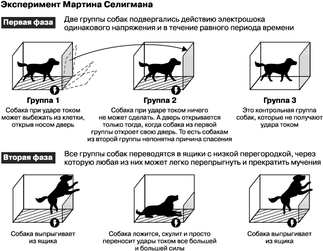 В качестве примера приведем описание одного эксперимента Селигмана. Было три клетки, в которых находилось по три собаки. В первой клетке имелась четкая петля обратной связи — собаки получали разряд тока, но если они нажимали на кнопку, ток отключался. Во второй клетке система обратной связи была нарушена — в клетку подавали ток, и когда собаки нажимали на кнопку, ток то отключался, то продолжал их бить. Собаки не понимали, на что реагировать. В третьей клетке находилась контрольная группа собак, которых не дрессировали, они просто жили в клетке. Затем происходило следующее: собак из первой и второй клеток пересаживали к собакам из третьей и пускали ток. Собаки из первой группы нажали на кнопку и выбежали из клетки. Собаки из третьей группы, увидев, как убегают их собратья из первой группы, выбежали вслед за ними. А собаки из второй группы упали на пол и стали жалобно выть. Это и есть состояние выученной беспомощности, когда существует цель, но достичь ее мы не можем, потому что не знаем, как реагировать на внешние стимулы.
