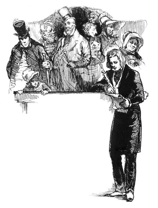 Когда мистер Мелл понес наверх свои башмаки, которые уже невозможно было починить, и оставил меня одного, я стал осторожно пробираться в дальний конец комнаты, разглядывая все, что попадалось мне на пути. И вдруг я увидел лежавший на парте картонный плакат с красиво выведенными словами: «Осторожно! Кусается!»