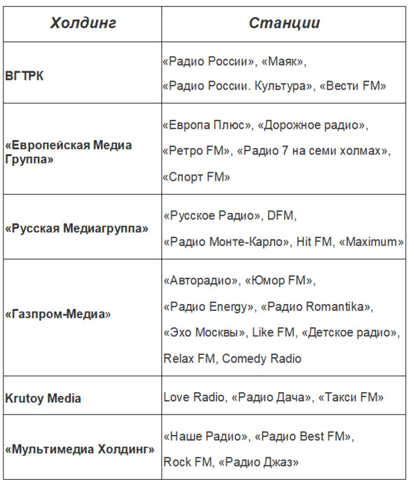 В состав ВГТРК входят федеральные телеканалы: «Россия 1», «Россия Культура», «Россия 2»; более 80 региональных телерадиокомпаний, вещающих во всех субъектах Российской Федерации; первый в России круглосуточный информационный канал «Россия 24»; международный телеканал на русском языке «РТР-Планета»; телеканал в формате высокой четкости «Россия HD»; русская версия телеканала «Евроньюс»; пять радиостанций — «Радио России», «Маяк», «Культура», «Вести ФМ» и «Юность»; государственный Интернет-канал «Россия», который объединяет десятки Интернет-ресурсов.