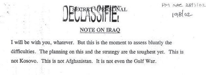 Эта записка, опубликованная в 2016 году в документе «Чилкот Репорт», подтверждает, что правительство Великобритании решило участвовать во вторжении в Ирак еще до слушаний в парламенте по этому вопросу. Это хорошо демонстрирует, что США и Британия действовали рука об руку ради поддержания мирового нефтяного порядка.