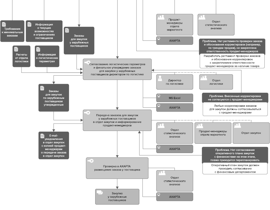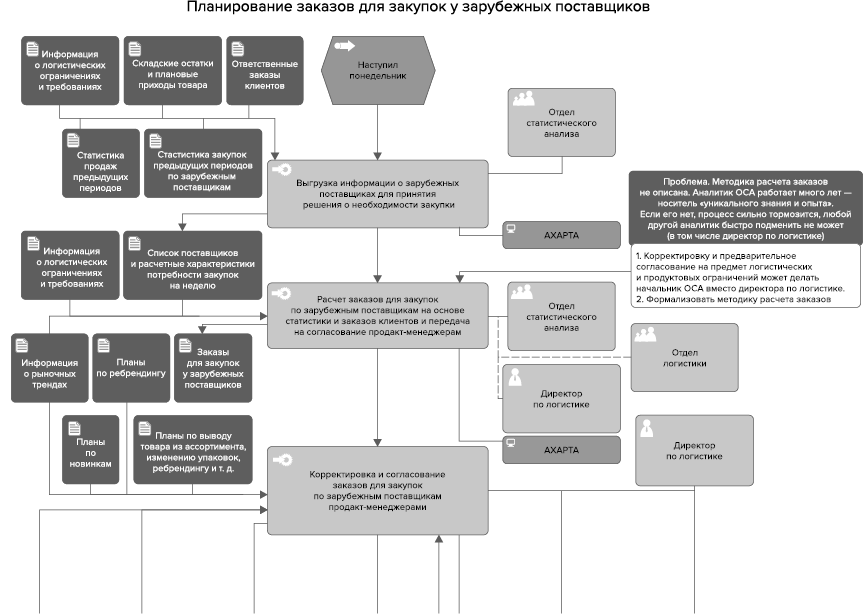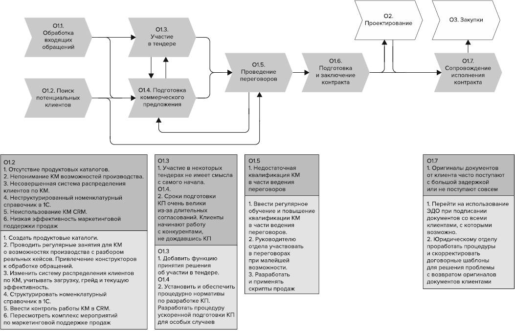 Такое расследование может вести и к побочным на первый взгляд вопросам, которые дают возможность вырабатывать совершенно неожиданные решения. Например, иногда требуется провести обучение участников процесса и привязать процессные показатели к их бонусным схемам — и процесс радикально ускорится. А иногда надо кропотливо перепроектировать сам дизайн процессной цепочки.