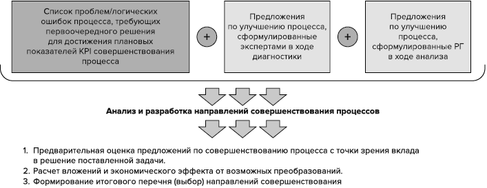 Определение направлений совершенствования происходит на Рабочих группах. Они формируются для каждого процесса после этапа его описания и локальной диагностики. Руководителем группы выступает, как правило, Владелец процесса. В состав группы включают наиболее активных, креативных и мотивированных на успешную трансформацию участников процесса, а также в соотношении 1:3–4 — представителей смежных подразделений, наиболее заинтересованных в результатах работы. Кроме того, в работе группы принимают участие аналитики-моделировщики и при необходимости сторонние эксперты, например консультанты.