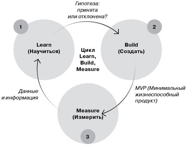 Для поиска PMF используется итеративный подход Learn, Build, Measure (научиться, создать, измерить). Это цикл, который делает упор на скорость как на важнейшую составляющую развития продукта (рис. 1.5).