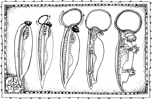Гипотеза Джонса с самого своего появления вряд ли могла кого-то убедить — жаль, конечно, учитывая, какие долгопяты милые. Но еще более невероятную гипотезу предложил Франсуа де Сарр: он утверждал, что двуногие человекоподобные существа появились не только раньше обезьян, но и до всех других видов четвероногих животных (то есть всех обитающих на суше позвоночных животных: земноводных, рептилий, млекопитающих и птиц) и даже рыб. И этот гомункул, считал де Сарр, развился непосредственно из водного «допозвоночного существа», наподобие ланцетника (сохранившегося до настоящего времени животного, напоминающего маленькую рыбку, с хордой, но без мозга или позвоночника). Получается, что человек сохранил самую древнюю из когда-либо существовавших форм туловища позвоночных, а все остальные — стегозавры, змеи, саламандры, коровы, капибары и коати — эволюционировали из человека. Мы — тот архетип, из которого возникли все позвоночные.