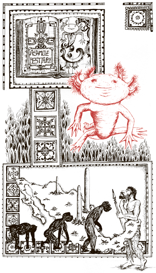 Аксолотль — это саламандра, один из около 500 сохранившихся в природе ее видов. Тысячелетиями люди считали, что саламандры имеют некую особую связь с огнем. В Бестиарии Эшмола, иллюстрированной книге о животных, написанной в Англии в эпоху раннего Средневековья, говорится: «Саламандра живет в огне, не чувствуя боли и не сгорая; саламандра не только не горит, но и может тушить огонь».
