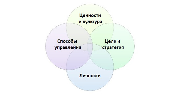 Для диагностики системы управления предприятием построим модель согласованности, состоящую из блоков «Цели и стратегия», «Личности», «Способы управления», «Ценности и культура».