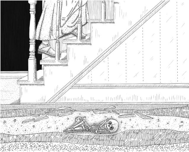Мелькают дни, проходят годы и века. Слежавшийся грунт крепко держит хрупкие косточки. Какие-то чужаки топчутся поверху, затем звуки шагов исчезают. Даже ледяные щупальца лютого холода не могут добраться до крошечного скелета. Еще десятки тысяч зим, и вдруг в глубину проникают глухие отзвуки ударов. Груз земли уже не так велик. Слышны голоса: люди строят дом там, где так давно никто не жил. Стучат грубые башмаки, бегающие туда-сюда по деревянной лестнице прямо над крошечными останками, слышна колыбельная — для живых над мертвым. В одно мгновение исчезает и дом. Земля дрожит, чьи-то руки разгребают ее. Крошатся комья земли, и на белый, тонкий, как яичная скорлупа, череп на миг падает луч летнего солнца. «Arrête! Os!» [5] — кричит кто-то. Грубые и одновременно нежные ладони — подобные тем, что в последний раз касались этого одинокого малыша, — тянутся вниз, чтобы наконец забрать его оттуда.