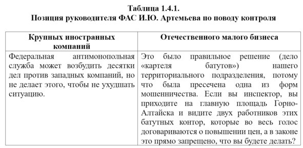 Таким образом, ФАС бьет почти исключительно по своим. При том, что иностранные компании доминируют на многих российских рынках (пиво, табачная продукция, фармацевтика, многие товары народного потребления и т.д.). Для государственной власти в нашей стране, к сожалению, с царских времен свойственно преклонение перед иностранцами в ущерб собственным гражданам[57]. В области контроля и надзора, в т.ч. антимонопольного, зачастую это выливается в политику двойных стандартов — как в США, только наоборот. К отечественному бизнесу подходят по всей строгости закона, а на нарушения иностранных компаний смотрят сквозь пальцы, «чтобы не ухудшить ситуацию»[58]. В таблице 1.4.1. приведены дословные цитаты руководителя ФАС, демонстрирующие политику двойных стандартов регулятора по отношению к крупным иностранным[59] и небольшим российским компаниям[60]. В условиях санкционных войн и напряженной международной обстановки это выглядит более чем странным.