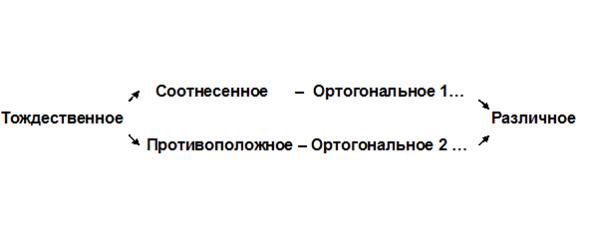 При этом один из аристотелевских видов противолежания — «противоречащее» — мы разделили на две части — на два совершенно самостоятельных сравнительных понятия: «Тождественное»: А = А. И «Различное»: А и не-А. Тогда как три других вида противолежания: «соотнесенное», «лишенность и обладание» и «противоположное», напротив, объединили в один вид, вводя для него общий термин — «градационное».