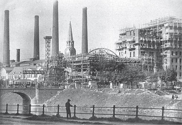 Вид на Замоскворечье с храма Христа Спасителя. На переднем плане церковь Св. Николая Чудотворца. За ней электростанция. Строительный участок слева