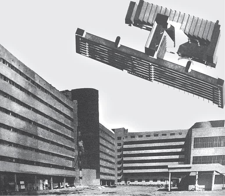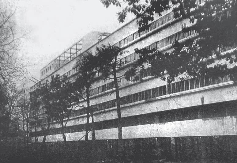 Архитекторам наступающей эпохи не довелось много построить. Дезурбанисты ждали «децентрации» производства, «дестационарности» населения и электрификации всей страны. Проекты «Зеленого города» под Москвой и «лент» складных жилищ в Магнитогорске не осуществились из-за отсутствия средств и инфраструктуры. Дома-коммуны создавались на базе существующих гостиниц или строились по мере поступления средств. В основу дома Ивана Николаева в Москве (1929–1930) легло пять базовых принципов: «Изгнание из своей жизни примуса – есть первый шаг. Бытовая коллективизация и организованность учебы – второй шаг. Третий шаг – гигиенизация, оздоровление быта. Четвертый шаг – переход на самообслуживание в быту и механизация процессов уборки. Пятый шаг – обобществление детского сектора». Здание состояло из двух параллельных корпусов, соединенных «санитарным блоком». Трехэтажный «дневной корпус» включал в себя столовую, спортзал, изолятор, солярий, детский сектор, зал для занятий и помещения для кружков. Проходя в конце дня через санитарный блок, жильцы должны были принять душ и переодеться. Восьмиэтажный ночной корпус состоял из тысячи «спальных кабин» площадью 6 × 6 м, расположенных вдоль узких коридоров длиной 200 метров. В каждой кабине было две койки, две табуретки и бетонный подоконник, служивший письменным столом. Прежде чем возвращаться в дневной корпус, студенты делали зарядку на балконах санитарного блока. Днем спальный корпус был закрыт на «санацию»[41].