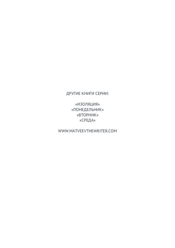 События книги начинаются в ночь, описанную в эпилоге «Среды». Андрей просыпается в плену, в шаге от собственной смерти. План тайного общества «Пангея» претворяется в жизнь. Для перехода к ключевому этапу им осталось избавиться от очевидцев терактов в метро Санкт-Петербурга и на борту самолета Москва — Нью-Йорк. Лис, Серега и Валера тоже находятся в заточении у маньяка на службе компании «WFL». Удастся ли им выбраться из плена, и как сложатся жизни других героев серии? Приятного прочтения!