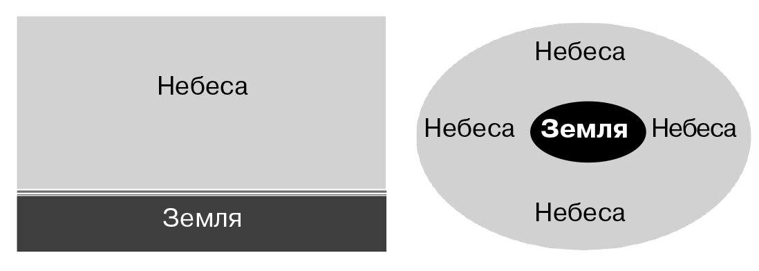 Ил. 1а, слева. Большинство ранних человеческих цивилизаций представляли мир состоящим из Небес наверху и Земли внизу. Ил. 1б, справа. Древние греки воспринимали Землю как камень, парящий в космосе.