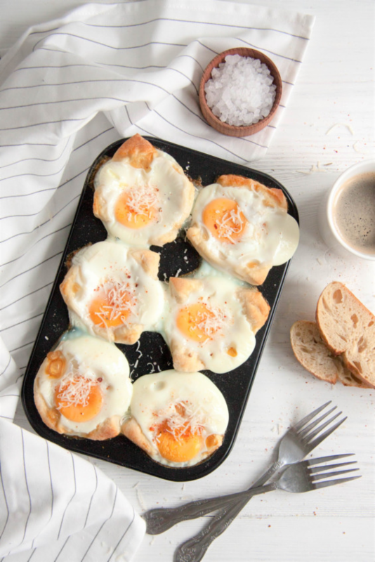 3. Поверх каждого куска теста добавляем плоские куски сыра, нарезанный мелкими кусочками бекон, и сверху разбиваем по 1 яйцу.
