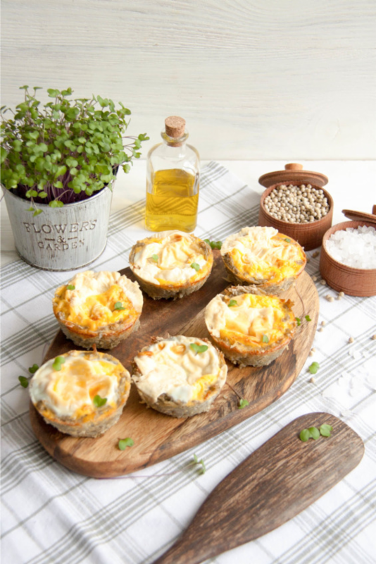 1. Картофель трем на крупной терке, тщательно отжимаем лишнюю жидкость. Берем форму для кексов и выкладываем корзиночки из картофеля, сверху солим, перчим и отправляем в духовку на 15 минут при 200С.