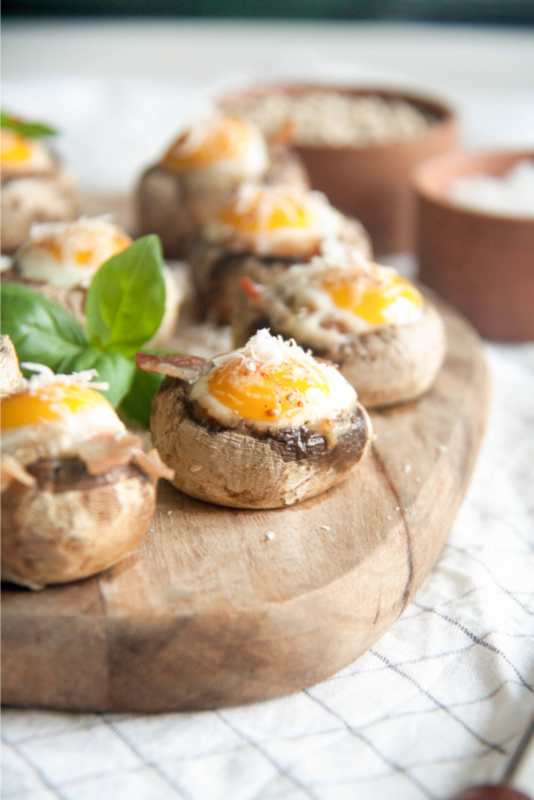 3. В каждый грибочек аккуратно разбиваем по перепелиному яйцу. Сверху добавляем соль и перец по вкусу, а также остатки пармезана.