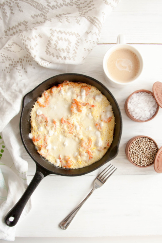 3. Далее в омлет добавляем половину сыра, креветки, солим и затем высыпаем остатки сыра сверху.