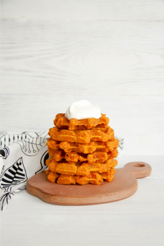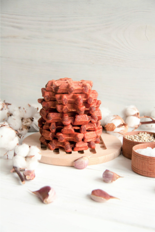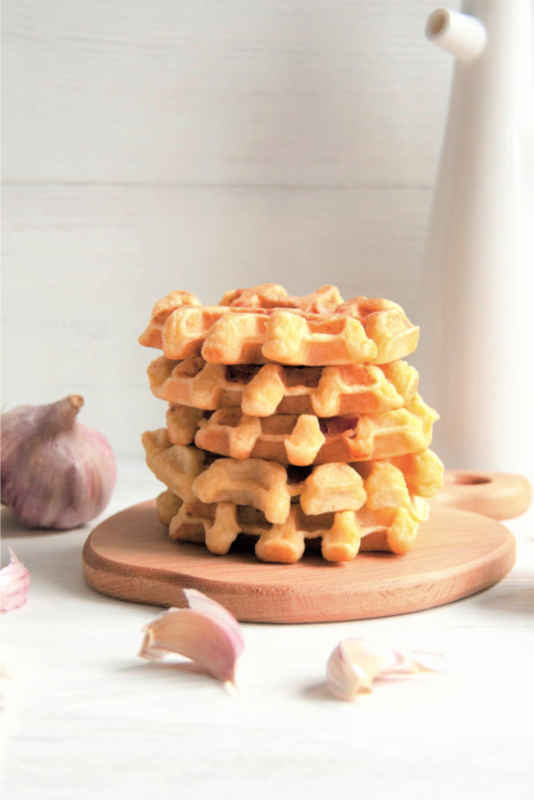 Вафли можно подавать с чесночным соусом или соусом тар-тар, а также добавив несколько кусочков обжаренного бекона.