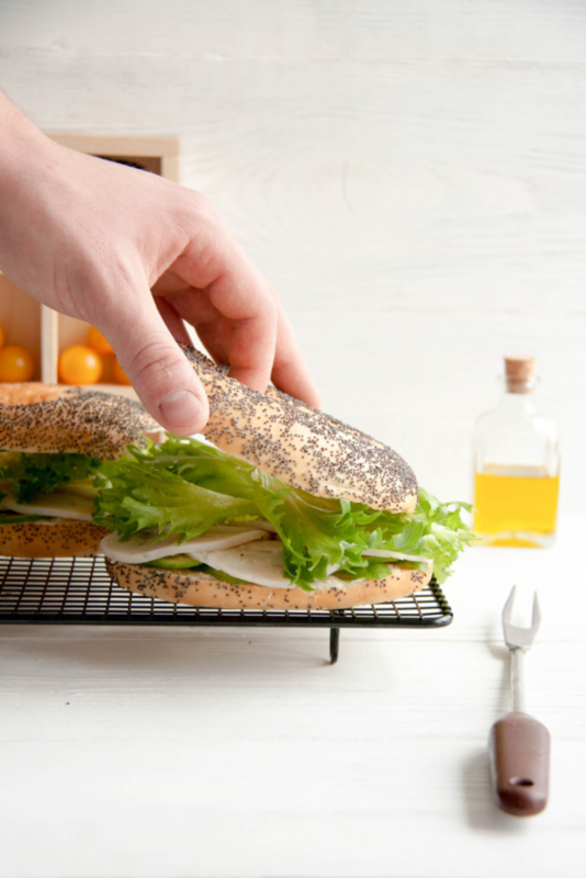 3. Сверху кладем нарезанный тонкими дольками огурец, далее кусочки куриного рулета и сверху листья салата. Накрываем второй половиной бейгла.