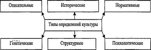 Описательные определения интерпретируют культуру как сумму всех видов человеческой деятельности, обычаев, верований; исторические — связывают ее с традициями и социальным наследием общества; нормативные — рассматривают как совокупность норм и правил, организующих человеческое поведение; психологические — представляют как совокупность форм приобретенного поведения, возникающих в результате приспособления человека к окружающим условиям жизни; структурные — представляют в виде единой системы различного рода моделей; генетические — основываются на понимании культуры как результате адаптации человеческих групп к среде своего обитания.
