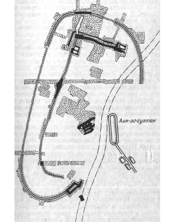 План раскопок, Иерихона в районе Аин-эс-Султан. Пунктиром обозначены раскопки, ведущиеся с 1930 года.