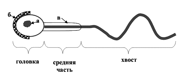 Рисунок 4. Сперматозоид: а – ядро; б – акросома; в – митохондрия жгутика