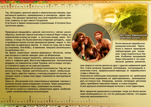 Это место когда-то и являлось эпицентром эдема изобилия — раем человекообразных антропоидов. Естественный первобытно-коммунистический Чернобыль и явился природной лабораторией для попавших сюда подопытных тварей. Изобилие калорийной пищи повышали и их социальный уровень развития, они запросто могли делиться друг с другом найденной едой.