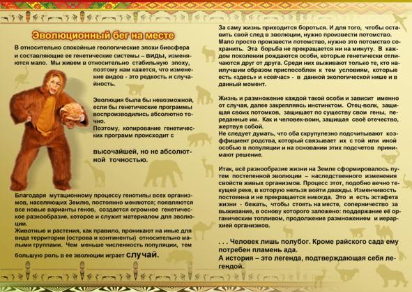 Итак, всё разнообразие жизни на Земле сформировалось путем постепенной эволюции — наследственного изменения свойств живых организмов. Процесс этот, подобно вечно текущей реке, в которую нельзя войти дважды. Изменчивость постоянна и не прекращается никогда. Это и есть эстафета жизни — бежать, чтобы стоять на месте, соперничество за выживание, в основу которого заложено: поддержание её органическим топливом, продолжение размножением и иерархией организмов.