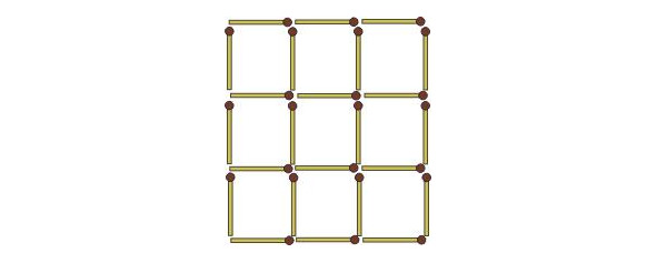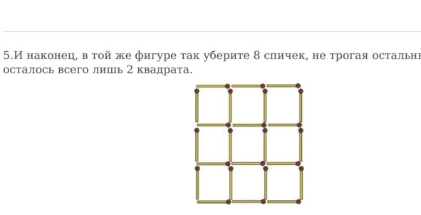 8. В решетке из спичек, представленной на рисунке, нужно так убрать 4 спички, не трогая остальных, чтобы осталось 5 квадратов.