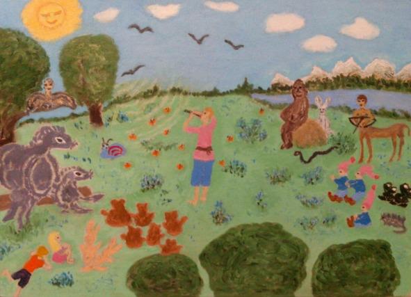 В глазах юноши стало лучиться счастье, он поднес музыкальный инструмент к губам, и вокруг заструилась волшебными звуками прекрасная музыка. Трава, цветы, бабочки, птицы, деревья и облака — все вдруг радостно ожило и затанцевало, переливаясь всеми цветами радуги.