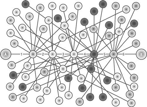Если посмотреть схематично на цепочку АВ, то мы увидим, что весь путь проходит через людей, которые имеют достаточно много других связей.