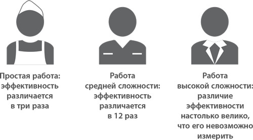 В одном показательном исследовании, описанном в журнале Harvard Business Review, говорится, что при выполнении простой работы, требующей принятия небольшого количества решений (как у работника ресторана быстрого питания), самые эффективные сотрудники показывают результаты в три раза лучше результатов самых неэффективных. При выполнении работы средней сложности (как у производственных рабочих на высокотехнологичном предприятии) самые эффективные сотрудники показывают результаты в 12 раз лучше. А при выполнении работы высокой сложности, где принятие верных решений имеет первостепенное значение (как у разработчика программного обеспечения или партнера в инвестиционном банке) разница между наиболее и наименее эффективными сотрудниками настолько значительна, что ее невозможно измерить1.