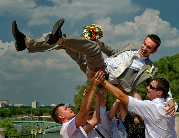 В разгар московского лета при смоге от горящих торфяников и довольно сильной облачности в середине дня, когда свет с трудом пробивался через самый короткий слой атмосферы, качали жениха. При этом до матрицы фотоаппарата добиралось максимальное количество ультрафиолетового излучения. Свет рассеивался кучевыми облаками, но синяя составляющая в освещении все-таки очень заметна. Если присмотреться к затененным белым поверхностям, это становится очевидным — они окрашены в синие и фиолетовые тона, благодаря чему краски в тенях выглядят слегка грязноватыми и выбеленными. В пленочные времена, когда снимали на слайд, полуденная сиеста была мертвым временем для пейзажистов. Снимали только в том случае, если охотились за возможностью передать особое состояние природы — полуденность. Я же снимал потому, что у меня выбора не было. При обработке пришлось столкнуться с заметной синюшностью кожи персонажей и подкорректировать этот дефект, причем отдельно исправлялись кожа и одежда.