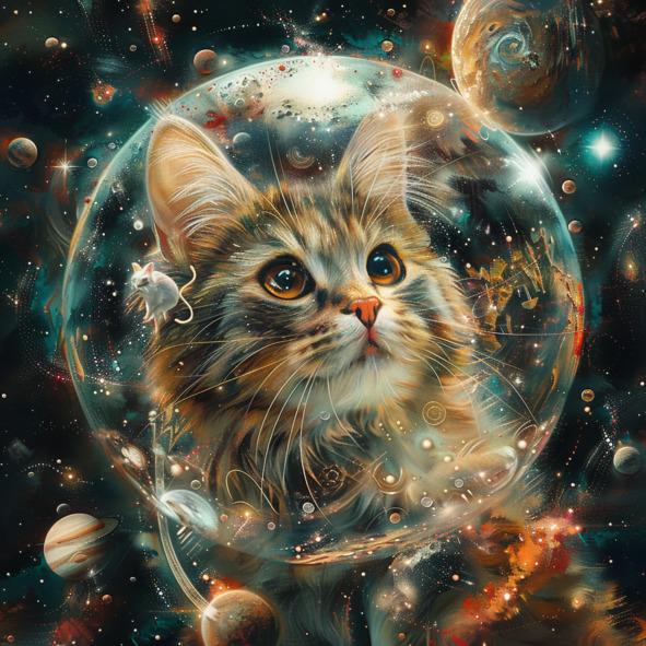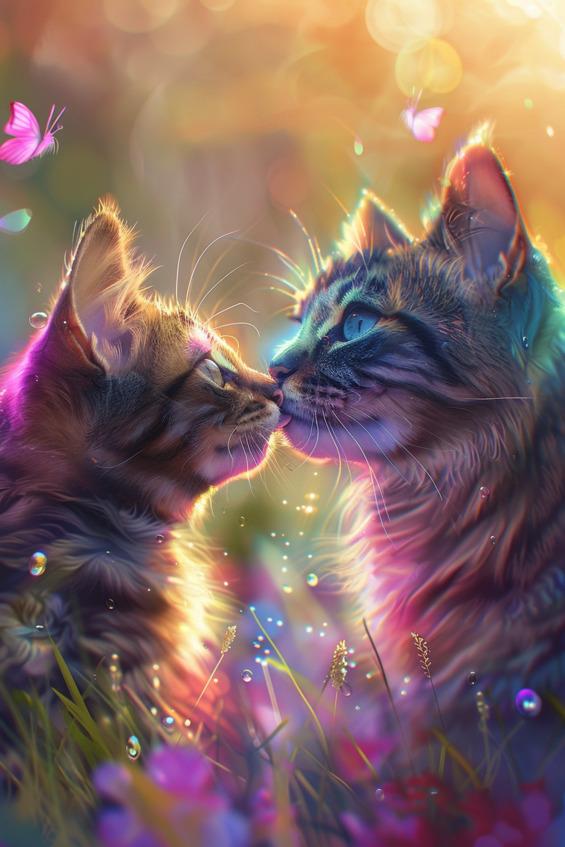 Промпт для Midjourney: «Hyper-realistic digital painting of a regular tabby cat meeting an otherworldly cat with iridescent fur and glowing blue eyes in a sunlit meadow. Soft morning light, dew on grass, butterflies in the background. Photorealistic details on fur and eyes».