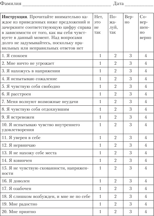 Цель.Данный тест является надежным и информативным источником информации самооценки уровня тревожности в данный момент (реактивная тревожность) и личностной тревожности (как устойчивая характеристика человека). Разработан Ч. Д. Спилбергером (США) и адаптирован Ю. Л. Ханиным.