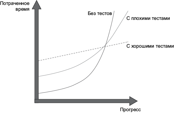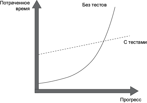 На рис. 1.1 изображена динамика роста типичного проекта без тестов. Все начинается быстро, потому что ничего вас не тормозит. Еще не приняты неудачные архитектурные решения; еще нет существующего кода, который необходимо прорабатывать и поддерживать. Однако с течением времени вам приходится тратить все больше времени, чтобы написать тот же по объему функционал, что и в начале проекта. Со временем скорость разработки существенно замедляется — иногда даже до состояния, в котором проект вообще перестает двигаться вперед.