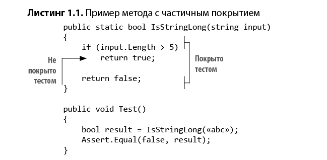 Рис. 1.5 показывает, как можно визуализировать эту метрику. Все возможные ветви в тестируемом коде представляются в виде графа, и вы проверяете, сколько из них были пройдены тестами. В IsStringLong таких путей два, а тест отрабатывает только один из них.