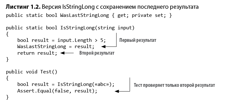 В листинге 1.2 приведена другая версия метода IsStringLong, которая записывает последний результат в свойство WasLastStringLong.