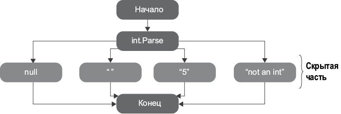 Метрика branch coverage показывает 100 %, и при этом тест проверяет все составляющие результата метода. Такая составляющая здесь всего одна — возвращаемое значение. В то же время такой тест совершенно не является исчерпывающим: он не учитывает ветвления, через которые может проходить метод .NET Framework int.Parse. В то же время даже такой простой метод может содержать большое количество ветвлений, как видно из рис. 1.6.