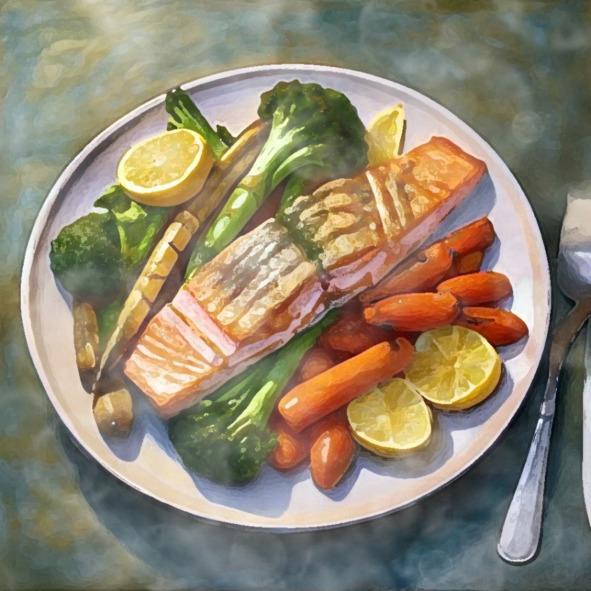 — Сегодня на ужин запечённая в духовке рыба с овощами. Всем приятного аппетита! — сказал папа, раскладывая еду по тарелкам, пока мама оформляла стол.