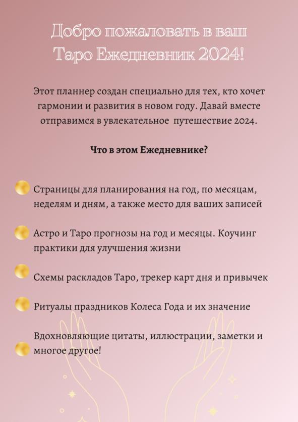«Таро ежедневник — 2024» — универсальный планнер для увлекающихся эзотерикой, Таро, самопознанием или планирует изучение. Здесь вы найдете астропрогноз на каждый месяц, Таро расклад на год и многое другое. И конечно, все необходимое для записи ваших дел и планов в течение года, схемы раскладов Таро, цели, подведение итогов, ритуалы по сезонам года.