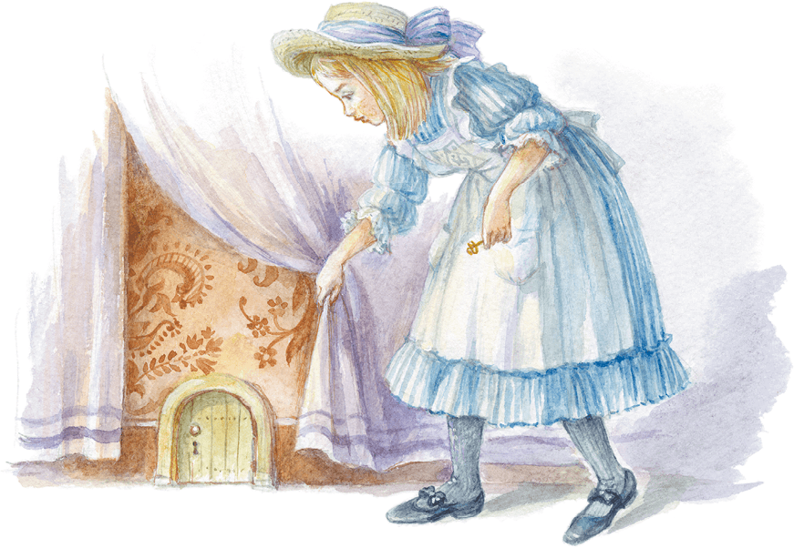 Обходя зал во второй раз, Алиса заметила занавеску, на которую раньше не обратила внимания. Приподняв её, она увидела низенькую дверцу – не больше тридцати сантиметров высотой, – попробовала вставить ключ в замочную скважину. К её величайшей радости, он подошёл!