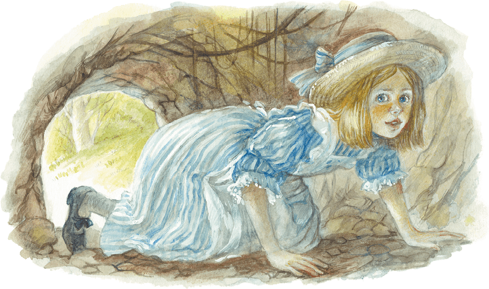 И вдруг – хлоп! – Алиса приземлилась на кучу листьев и сухих веток, но ни капельки не ушиблась и тотчас же вскочила на ноги. Посмотрев вверх, она ничего не увидела – над головой была непроглядная темень. Осмотревшись вокруг, Алиса заметила прямо перед собой длинный тоннель, а ещё увидела Белого Кролика, который со всех ног улепётывал по этому тоннелю. Нельзя было терять ни минуты. Алиса помчалась за ним и услышала, как он, поворачивая за угол, пробормотал: