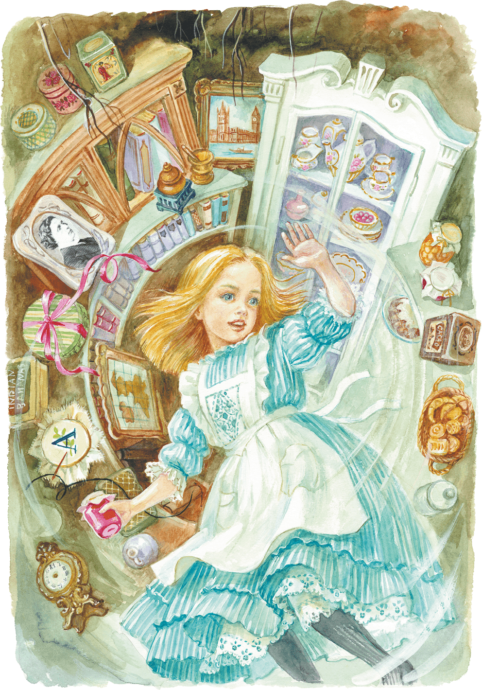 Внизу ей разглядеть ничего не удалось: сплошная чернота, – тогда она стала рассматривать стены колодца. Её взору предстали шкафы с книгами и полки с посудой, и что уже совсем удивительно – географические карты и картины. Пролетая мимо одной из полок, Алиса схватила стоявшую на ней банку и увидела бумажный ярлычок с надписью: «Апельсиновый джем». Однако, к величайшему огорчению Алисы, банка оказалась пустой. Сначала она хотела просто бросить её, но, побоявшись попасть кому-нибудь в голову, ухитрилась поставить на другую полку, мимо которой пролетала.