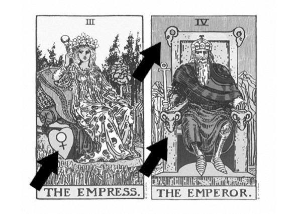 Посмотрите на щит Императрицы. Символ Венеры на нем — самое прямое указание на астрологические свойства карты. Посмотрите на трон Императора — он украшен головами баранов, поскольку Императору соответствует Овен. Самая популярная в мире колода, по сути, результат стремления намекнуть на эти связи, рассказать о том, что тогда было частью охраняемой тайны. И можно ли рассчитывать на глубокое понимание карт, если при их изучении будет игнорироваться то, что вкладывал в них автор? А это астрология и каббала, как минимум?