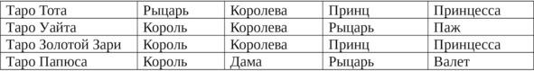 Обратите внимание: то, что в Таро Уайта — Король, то в Таро Тота — Рыцарь. То, что у Таро Уайта Рыцарь, то в Таро Тота и Золотой Зари — Принц. Помимо этого можно встретить самые разнообразные варианты названий — Воин, Слуга, Сын, Праматерь, Всадник, Вестник, Муза, и даже Тренер, а иногда Фигурные карты связывают не с фигурами людей, а со странами, народами и историческими периодами, но все эти экзотические варианты не имеют важного значения. Чтобы не запутаться в названиях учитывайте следующие соотношения, приведенные в таблице.
