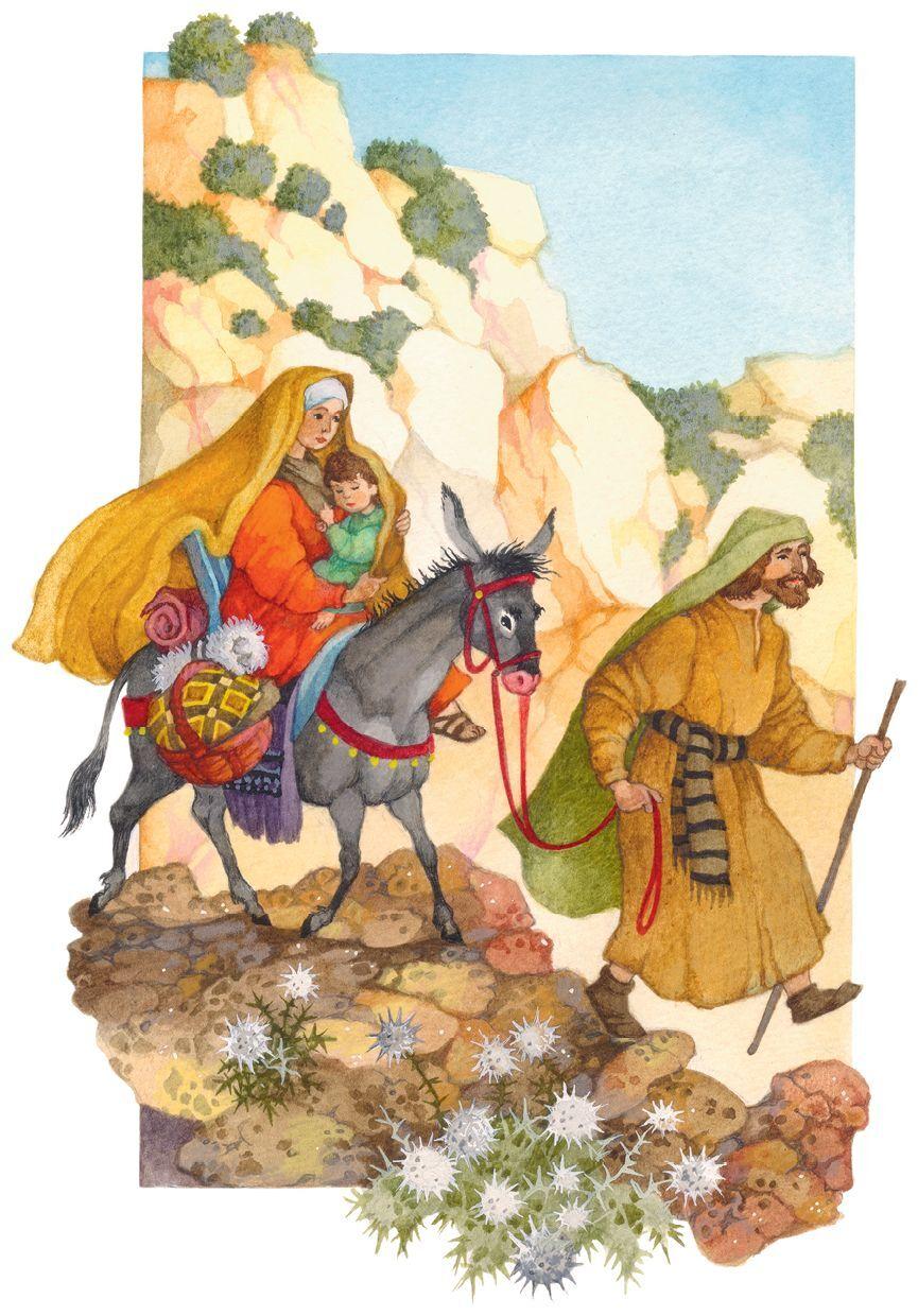Как только волхвы удалились из Вифлеема, Ангел Божий явился во сне Иосифу. Он велел ему встать, взять Младенца, Мать Его, идти в другую страну – Египет и оставаться там. Иосиф без промедления исполнил повеление Ангела. Он посадил на осла Марию с Божественным Младенцем, и Святое Семейство отправилось в Египет.
