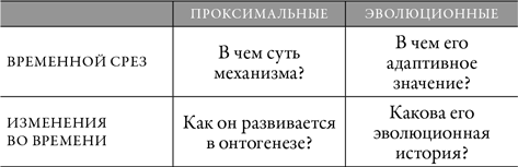 Удостоенный Нобелевской премии этолог Нико Тинберген в своей статье 1963 года подчеркнул различие между двумя подходами, сформулировав так называемые «четыре вопроса Тинбергена»: в чем суть того или иного механизма; как данный механизм развивается в онтогенезе, то есть у отдельной особи; в чем его адаптивное значение и, наконец, какова его эволюционная история [17]. Я много лет обращался к этим вопросам, но только потом понял, что два из них — проксимальные, два — эволюционные, два рассматривают один временной срез, а два — изменения во времени. Их можно свести в небольшую таблицу. Когда я стал показывать ее в виде слайда на своих лекциях, слушатели заинтересовались ею больше, чем моим монологом. Я выложил ее у себя на сайте, и она быстро разошлась по сети.